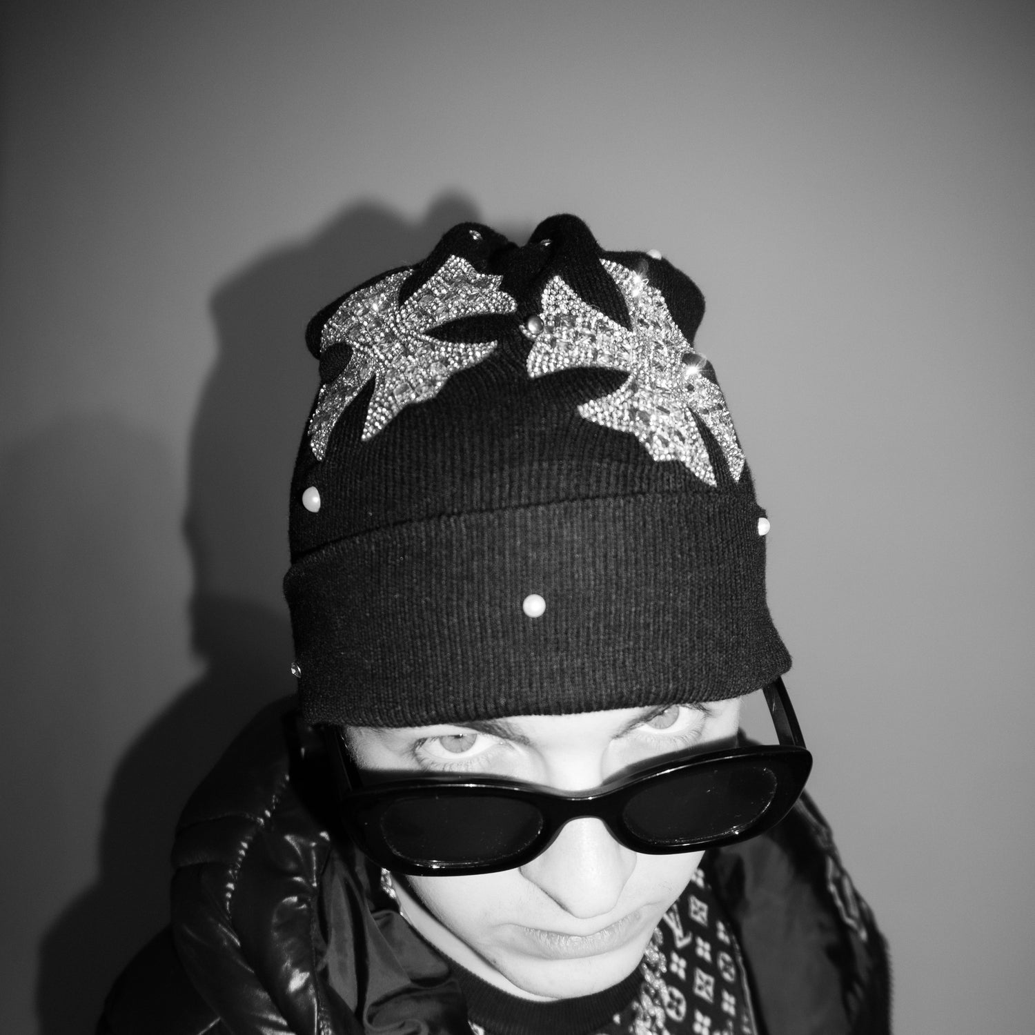 DROP GORRO NEGRO CON CRUCES ADIAMANTADAS Y PERLAS EDICIÓN LIMITADA
